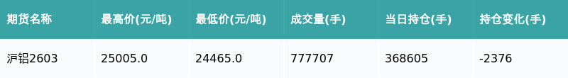 21智讯1月14日电,南财金融终端盘后期货数据显示日天金策略,上海期货交易所的沪铝主力合约收跌0.06%日天金策略,收盘报24595.0元/吨日天金策略,日内资金流入2086.03万元。其他相关指标见下表: