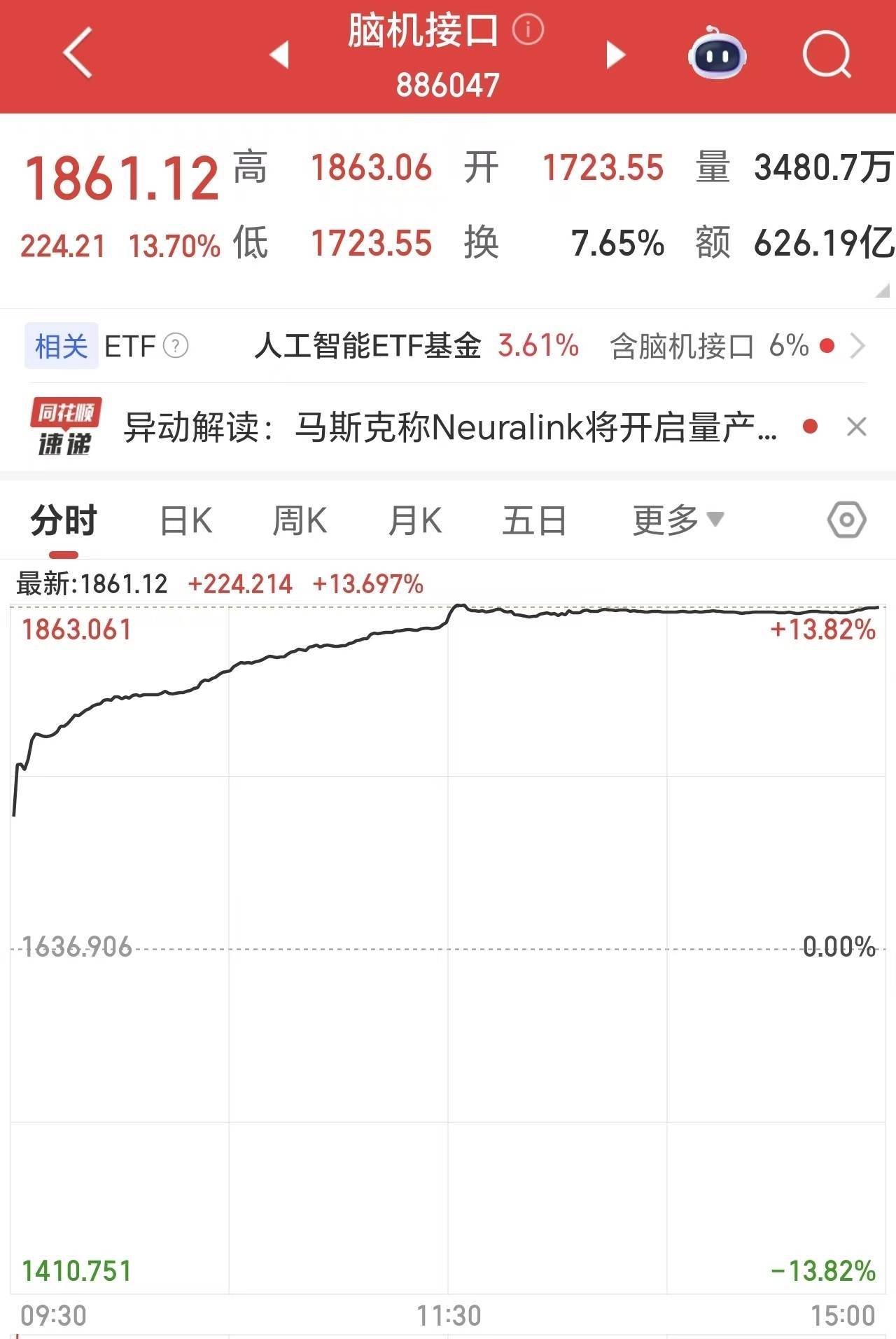 1月5日,A股新年开盘首日,脑机接口板块迎来“开门红”泓利财富泓利财富泓利财富,概念指数盘中大涨超13%,登顶日内最强板块。板块内个股掀起涨停潮,倍益康实现30CM涨停,三博脑科、翔宇医疗、美好医疗等斩获20CM涨停,岩山科技、国际医学、塞力医疗等多股强势封板,这一前沿赛道得到资本的追捧。