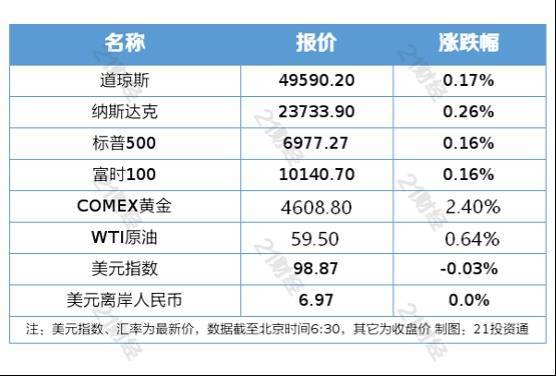 纽约股市三大股指1月12日上涨。截至当天收盘,道琼斯工业平均指数比前一交易日上涨86.13点,收于49590.20点,涨幅为0.17%;标准普尔500种股票指数上涨10.99点,收于6977.27点,涨幅为0.16%;纳斯达克综合指数上涨62.56点,收于23733.90点,涨幅为0.26%,道指与标普500创历史收盘新高。大型科技股涨跌不一,谷歌涨1%,苹果、特斯拉小幅上涨;英特尔跌超3%。热门中概股多数收涨,纳斯达克中国金龙指数涨4.26%,阿里巴巴涨超10%,哔哩哔哩涨近9%,小鹏汽车涨超8%,百度、微博涨超6%。