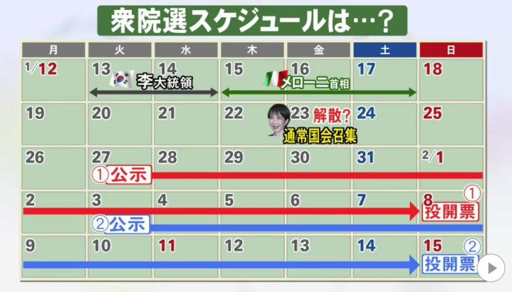 高市早苗在1月19日的记者会上正式公布,将于1月23日解散众议院。此次选举将于1月27日开始公示,2月8日投票并开票。高市表示,希望通过此次选举,进一步巩固政权基础。高市当天在记者会上表示,解散众议院是“与国民一起决定日本前进方向”,是一次“极其沉重的决定”。她进一步表示,希望国民将国家治理托付给她。高市解释称,她自上任伊始,“一直在意高市内阁尚未接受政权选择选举洗礼这一点”。日本选举制度中,最大党自动获得组阁资格。高市早苗去年10月通过自民党总裁选举获得组阁资格,彼时自民党与维新会执政联盟占有众议院231席,但是众议院席位并未经过重新选举。
